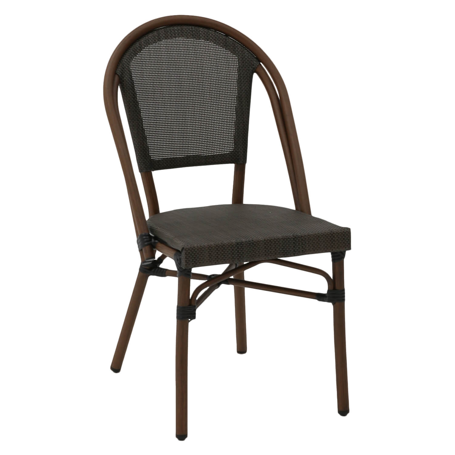 Entdecken Sie die klassische Eleganz dieses Terrassenstuhls in Schwarz mit einem warmbraunen Aluminiumrahmen, perfekt für Außenbereiche, die Stil und Komfort ausstrahlen möchten. Hergestellt aus hochwertigem Kunststoff im Rattan-Stil, ist dieser Stuhl nicht nur langlebig, sondern auch leicht zu reinigen und wetterbeständig. Das stapelbare Design macht ihn praktisch für die Lagerung und ideal für den intensiven Einsatz auf gut besuchten Terrassen.